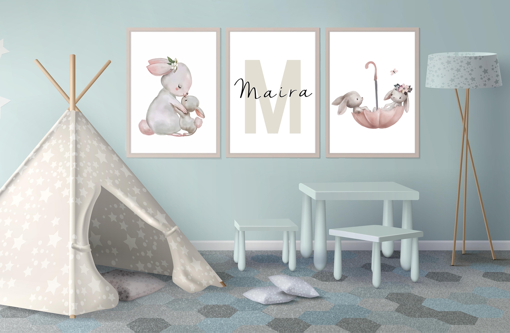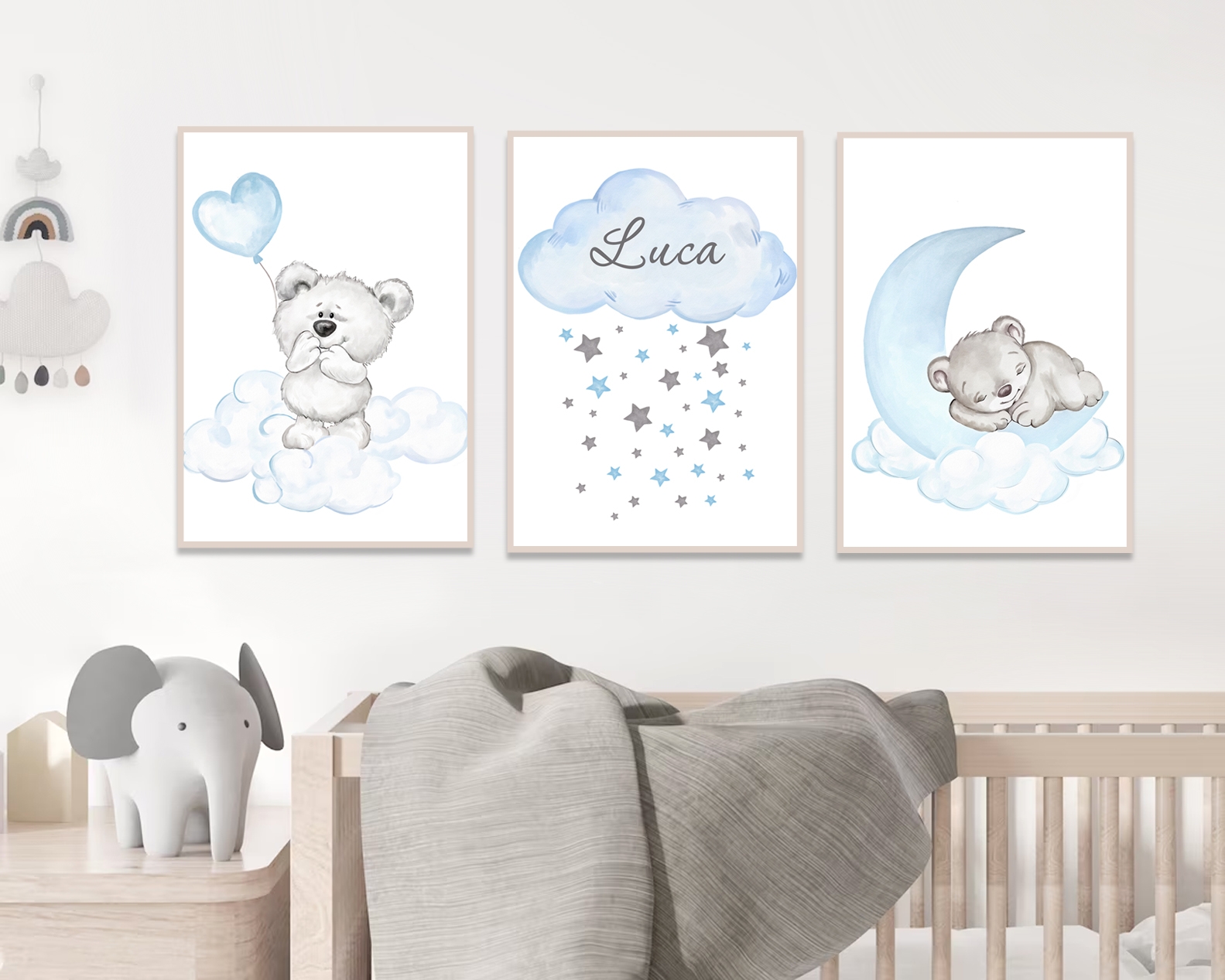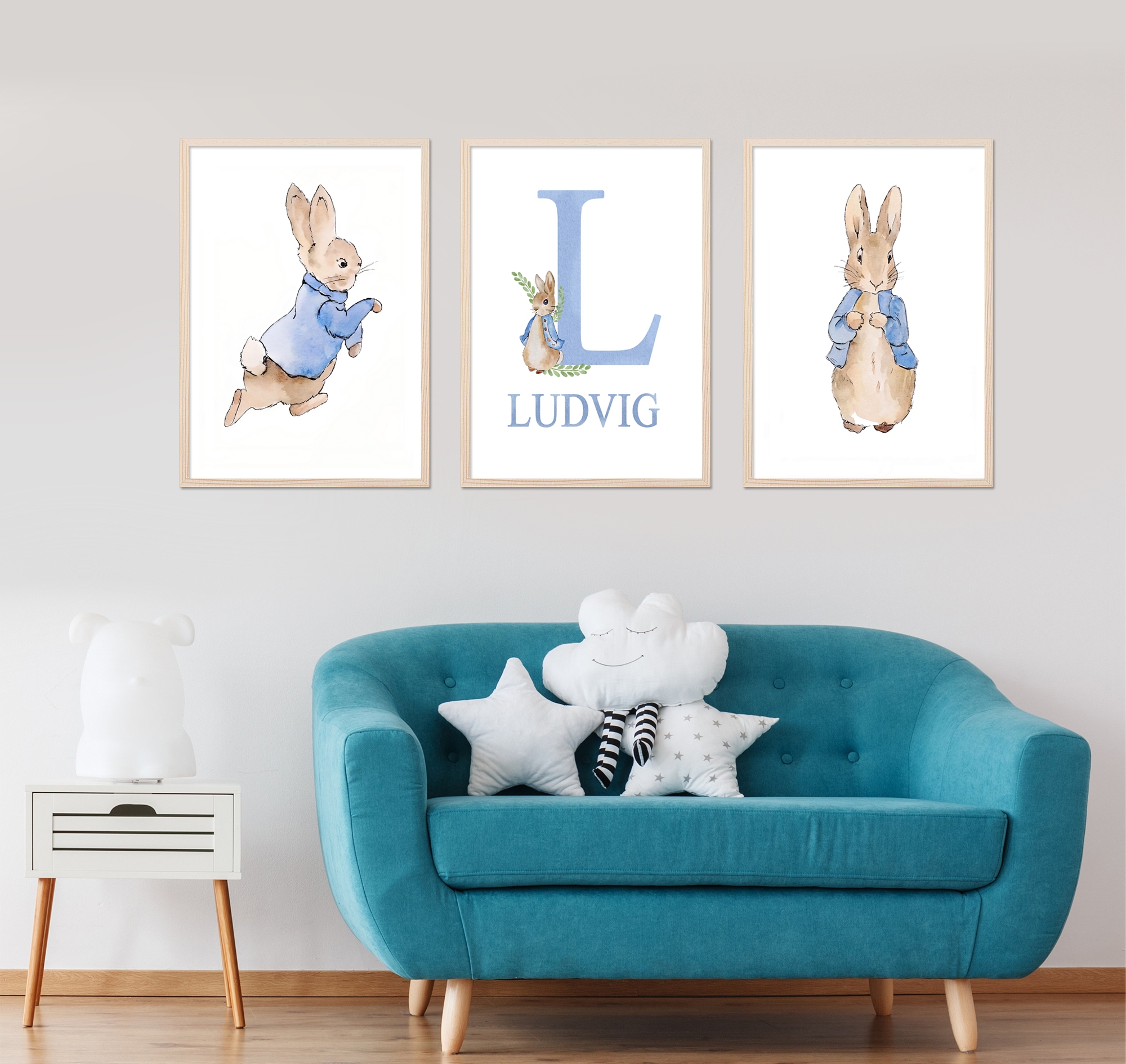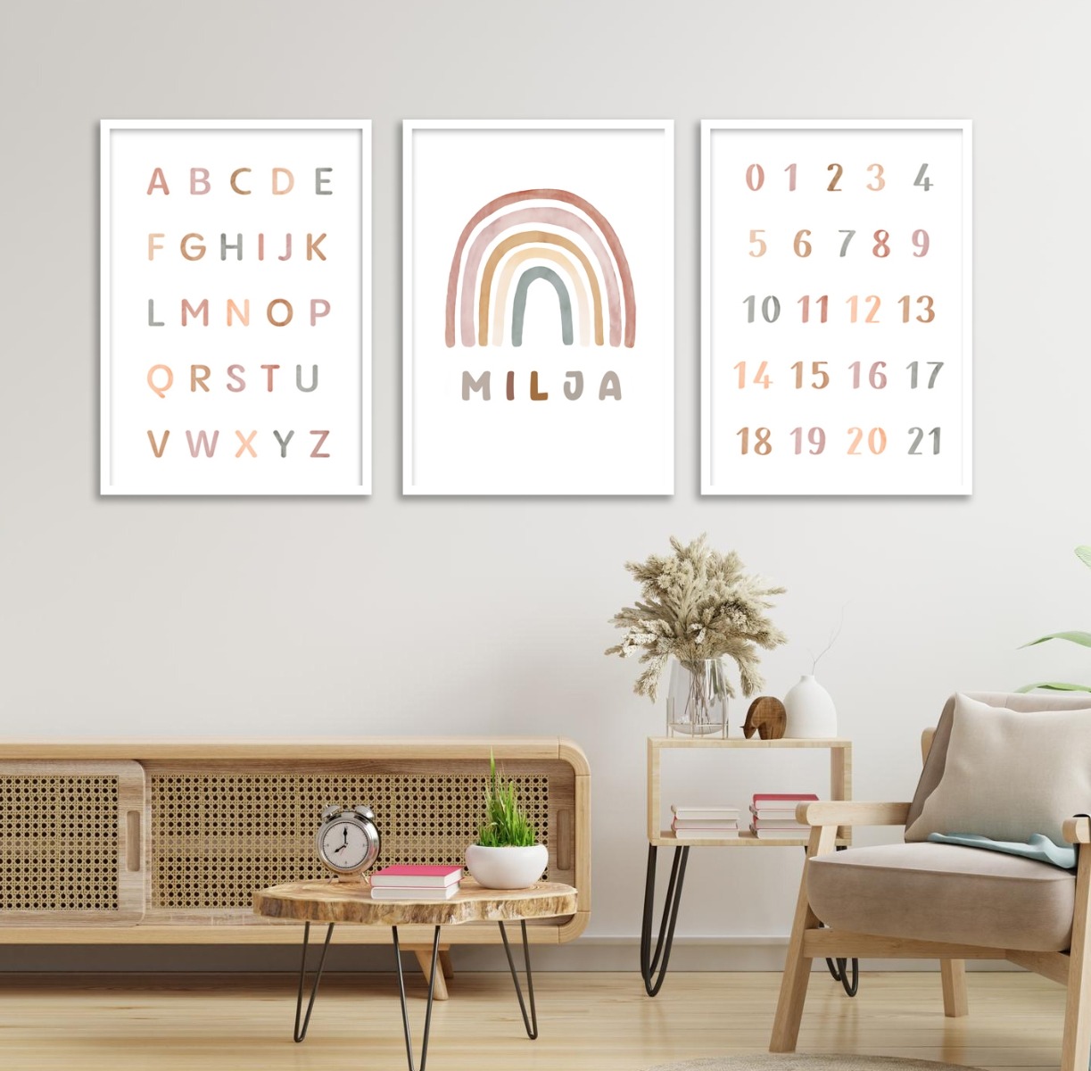 Our watercolor posters can be customized with names and are available in various motifs, from animals and flowers to excavators. These posters are sold individually and in sets of three, making them ideal for creating cohesive wall art. The soft, flowing colors create a harmonious and soothing atmosphere in any room, perfect for children's rooms or cozy corners at home.