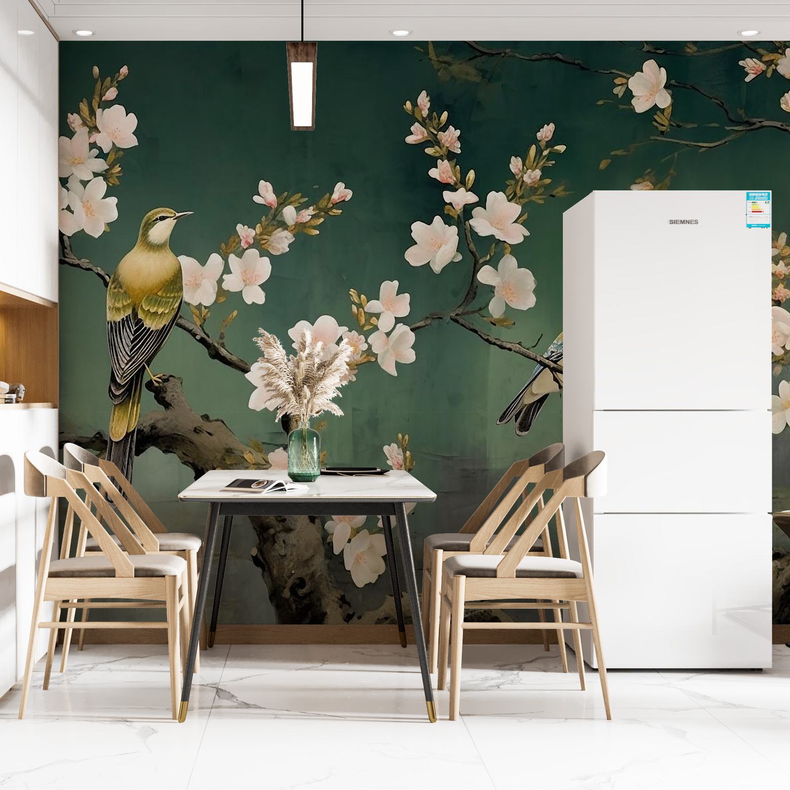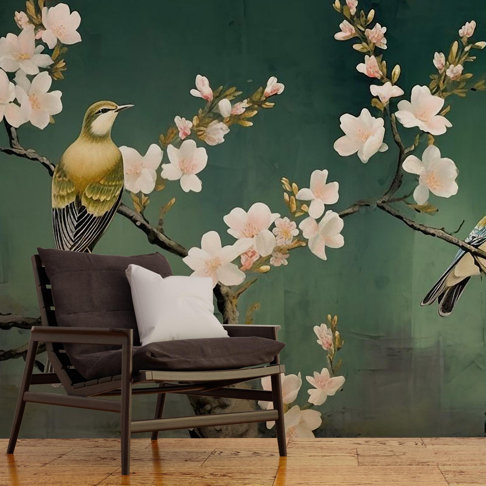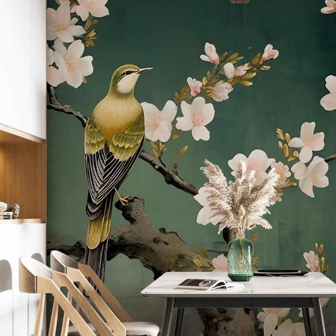 This exquisite wall paper features a beautiful depiction of birds perched among cherry blossoms, creating a serene and elegant atmosphere. Perfect for adding a touch of nature and tranquility to any room. The intricate details and soft colors make it an ideal choice for home decor.